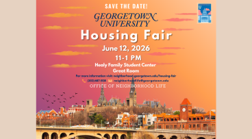 The Housing Fair is designed to assist Georgetown students with their housing needs and to help facilitate, for some, a smooth transition to the DMV area, and for others, a smooth transition from on-campus living to off-campus living. Hosted by The Office of Neighborhood Life.